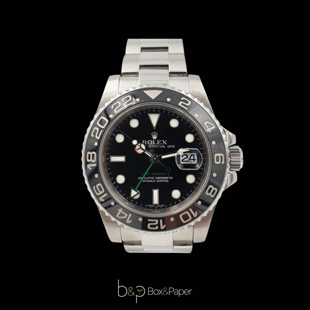 È realizzata interamente in acciaio e dotata della lunetta in ceramica nera, il quadrante è nero con la scritta Gmt-Master II e la lancetta delle 24 ore, verde.