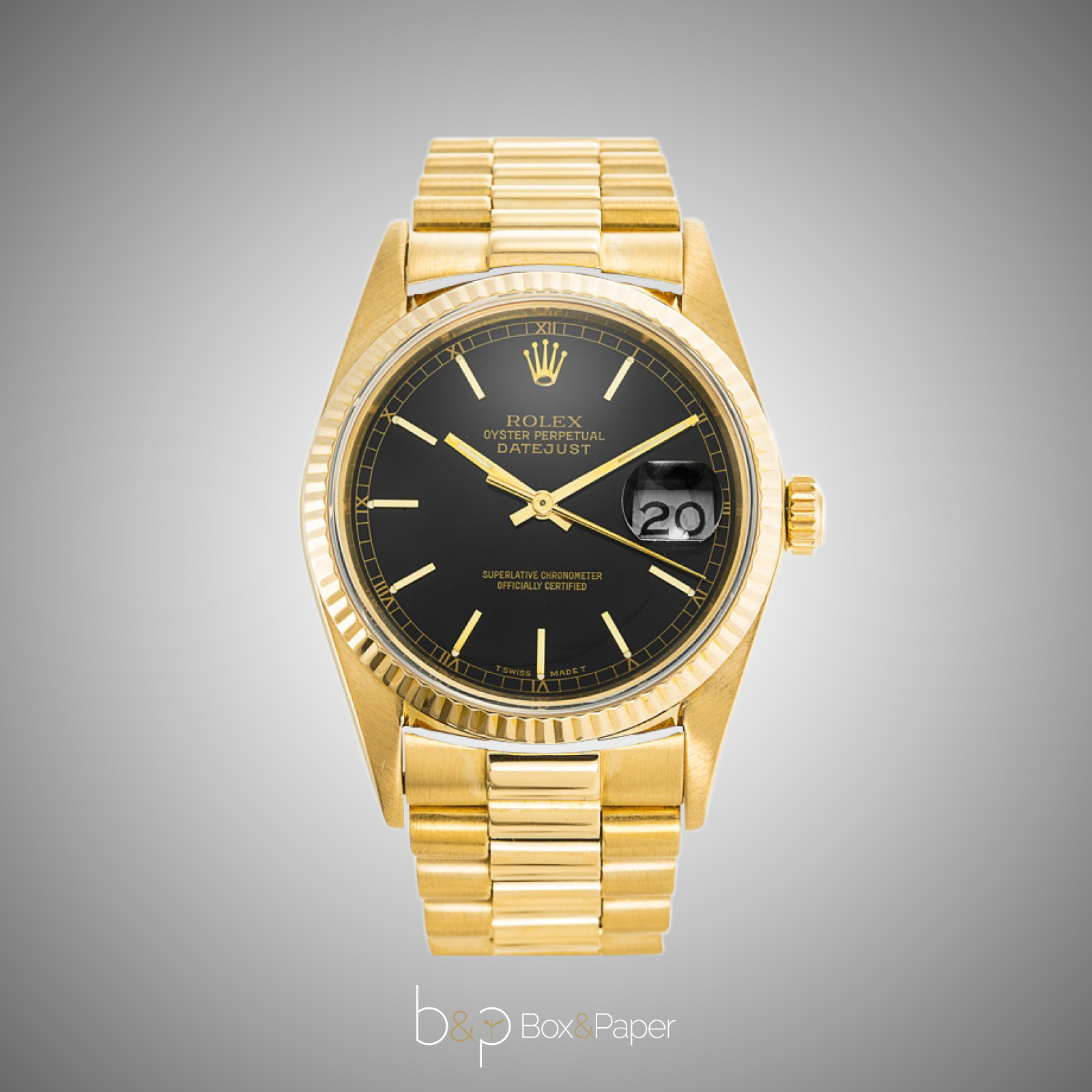 Con l’introduzione del cambio rapido della data, nel 1977 Rolex lancia sul mercato il nuovo Rolex Datejust con referenza 16078 realizzato in oro giallo 18 ct. e con lunetta “bark”. Nel 1988 termina la produzione di questo orologio a cui succederà la nuova serie con vetro zaffiro e calibro 3135. La cassa Oyster è garantita impermeabile all’acqua fino a 50 m di profondità. Poteva essere equipaggiato con bracciale Jubilee ref.8210. Monta il calibro 3035, all’interno del fondello porta incisa la referenza 16008.