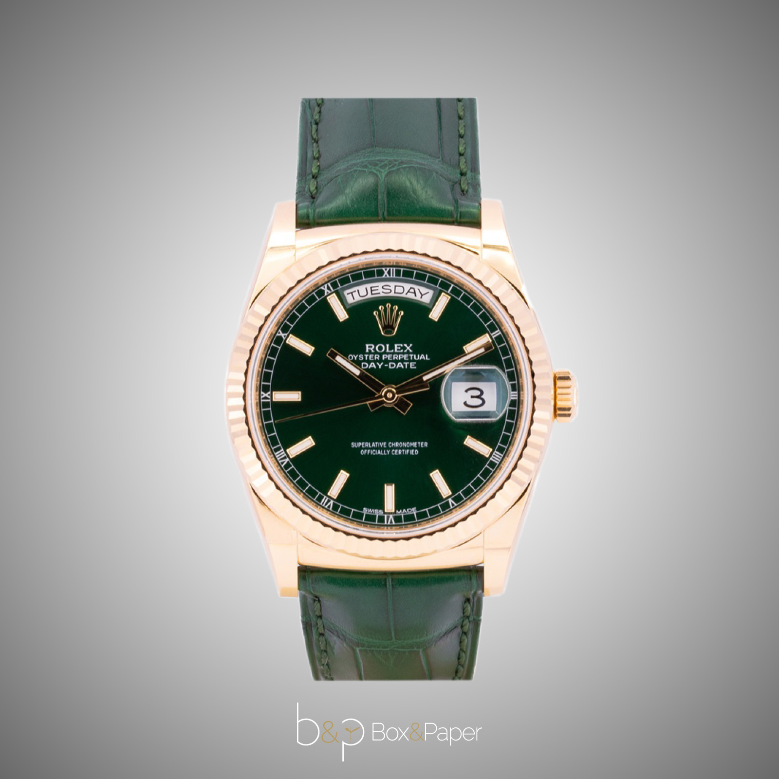 Nel 2013 Rolex arricchisce la sua collezione di Day-Date con nuove referenze con cinturini in pelle. Tra questi, la referenza 118138 da 36 mm di diametro è realizzata in oro giallo 18 carati e presenta una lunetta zigrinata. Il quadrante si presenta in due nuove varianti abbinate al cinturino in coccodrillo, verde e marrone cognac. Il cinturino di cui è dotato presenta la deployante a scomparsa in oro 18 ct. con chiusura regolabile. È garantito impermeabile fino a 100 m di profondità. Per questo dispositivo il COSC ha rilasciato il certificato di Cronometro Superlativo.