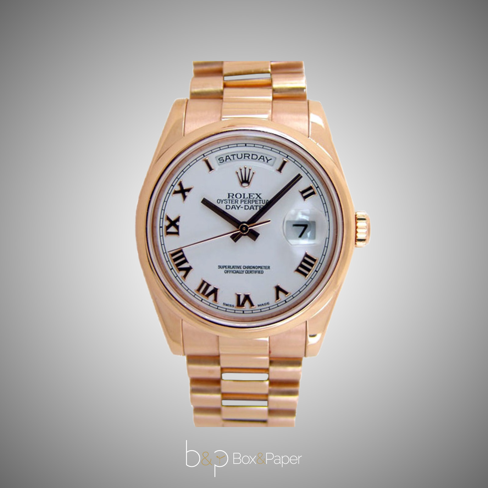 Nel 2000 Rolex presenta nuove versioni del Day-Date, aggiornate nelle linee. Questo Day-Date in oro rosa 18 ct. con lunetta liscia presenta il calibro 3155, un movimento a carica automatica prodotto interamente da Rolex. È equipaggiato dal bracciale President con chiusura a scomparsa. Questo orologio con cassa da 36 mm ha ottenuto la certificazione di Cronometro Superlativo rilasciata dall’Istituto Svizzero di Controllo Ufficiale per cronometri (COSC) ed è impermeabile all’acqua fino a 100 mt di profondità.