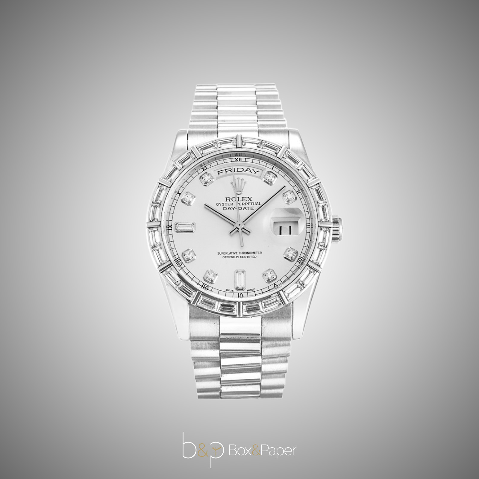 Nel 2000 la collezione Oyster Perpetual Day-Date si arricchisce con nuove referenze. Tra queste, la referenza 118366 monta il calibro 3155, caratterizzato dal doppio scatto rapido che facilita la regolazione della data e del giorno della settimana. Questo orologio è realizzato in platino con lunetta con 24 baguettes ed è accompagnato dal bracciale President. Il quadrante presenta indici con brillanti e baguettes. Per questa referenza è presente però un’ampia selezione di quadranti, alcune delle quali riservate esclusivamente ai modelli in platino.