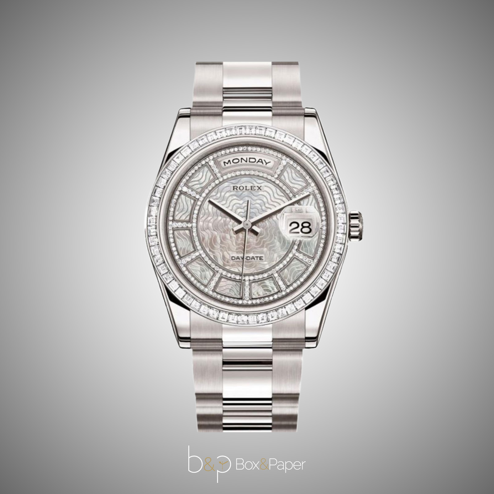 Nel 2013 Rolex lancia sul mercato una nuova versione dell’Oyster Perpetual Day-Date. La referenza 118399 BR caratterizzata da un quadrante esclusivo, presenta una cassa Oyster da 36 mm di diametro che garantisce un’impermeabilità all’acqua fino a 100 m di profondità. Realizzato in oro bianco 18 carati, questo orologio presenta una lunetta con 60 diamanti taglio baguettes. È equipaggiato da un bracciale Oyster con chiusura a scomparsa. Monta il calibro 3155, un movimento a carica automatica interamente prodotto da Rolex.