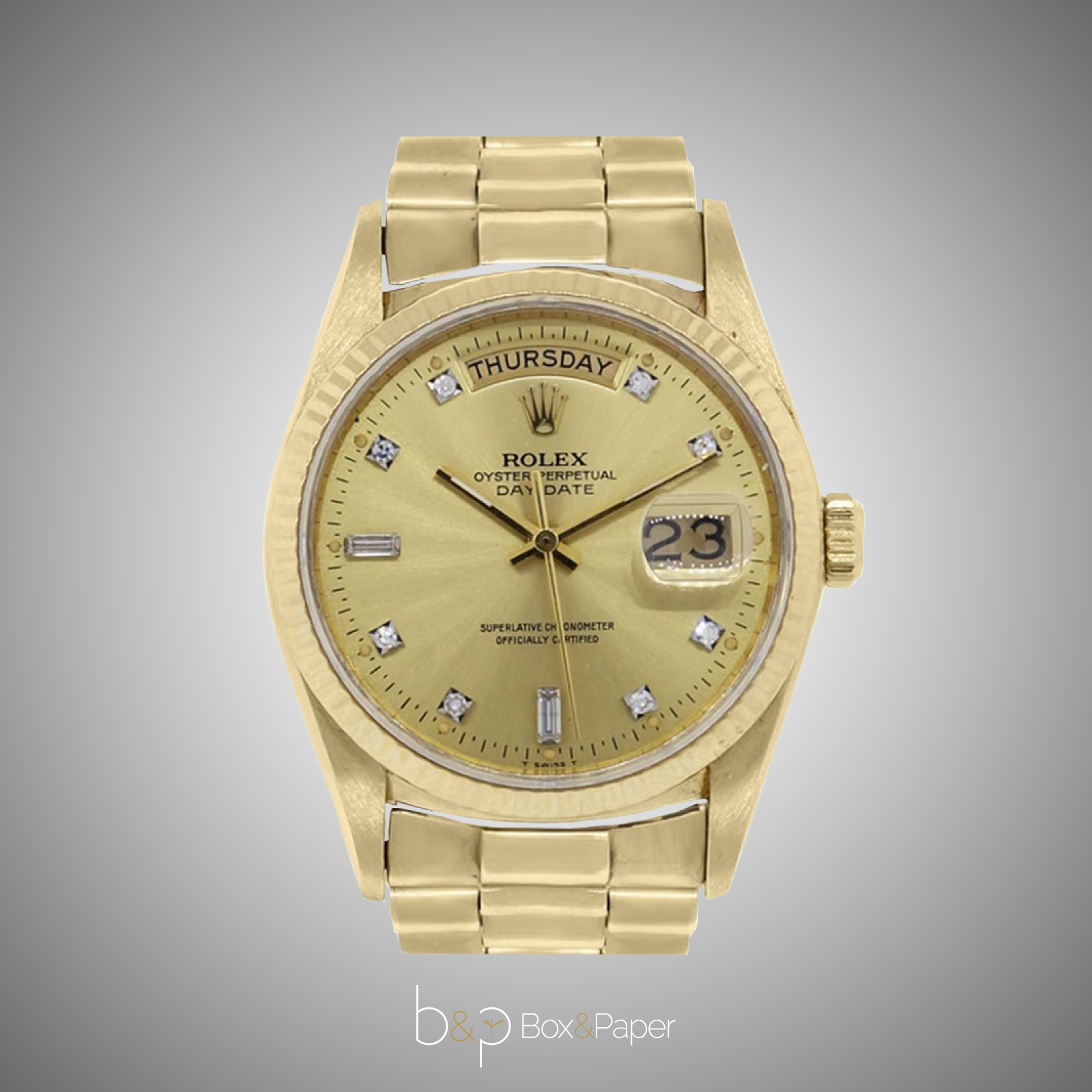 Nel 1977 Rolex lancia sul mercato nuove referenze Day-Date con scatto rapido della data e nuovo vetro minerale in zaffiro. Tra queste, la referenza 18038 realizzata in oro giallo 18 ct. e dotata di lunetta zigrinata, è accompagnata dall’esclusivo bracciale President 7286/8 o da un bracciale President con chiusura a scomparsa Ref. 8385/8. Monta il calibro 3055. Il suo movimento, ufficialmente controllato, ha ottenuto il titolo di Cronometro Superlativo.