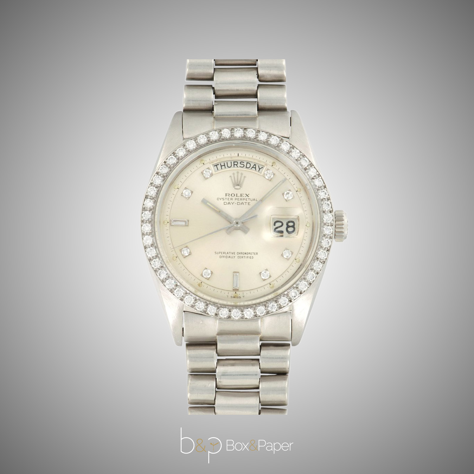 A partire dal 1961 la collezione Oyster Perpetual Day-Date si arricchisce di nuove referenze, tra cui la 1804. Questo modello è realizzato in oro 18 carati o in platino ed è dotato di lunetta con 46 diamanti a taglio brillante. Monta sia il calibro 1555 sia il calibro 1556.