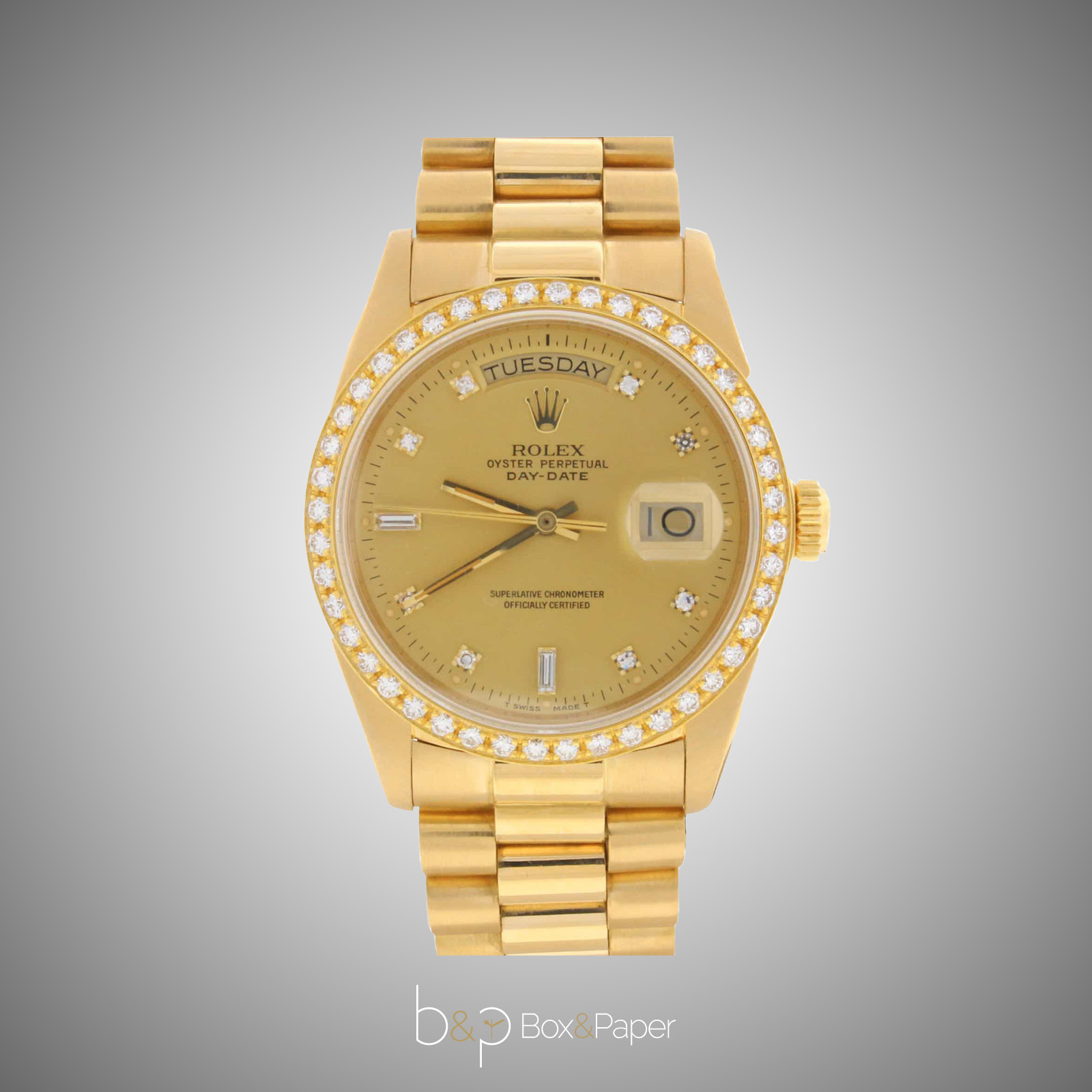 Nel 1977 Rolex introduce il nuovo movimento 3055, lo scatto rapido della data e una nuova tipologia di vetro minerale zaffiro che rende il Day-Date impermeabile all’acqua fino a 100 m di profondità. La referenza 18048 è realizzata in oro giallo 18 ct. e presenta una lunetta con brillanti. Può essere equipaggiata da un bracciale President 7286/8 o President con chiusura invisibile 8385/8 o President con brillanti Ref. 8485/8.
