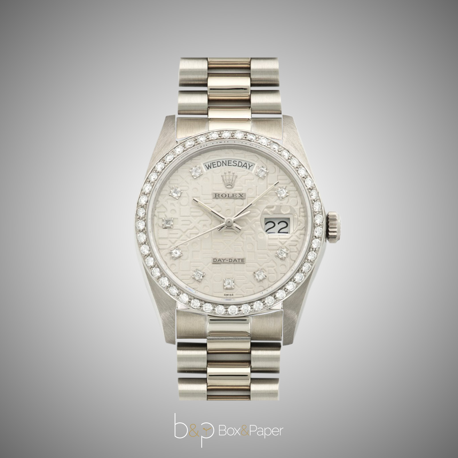 È il 1977 quando Rolex introduce lo scatto rapido della data, il nuovo vetro in zaffiro e il calibro 3055. Tra i nuovi modelli presentati, la referenza 18049 è realizzata in oro bianco 18 ct. con lunetta con brillanti. Questo Day-Date è equipaggiato da un bracciale President o President con chiusura a scomparsa. La cassa Oyster di cui è dotato lo rende impermeabile all’acqua fino a 100 mt.