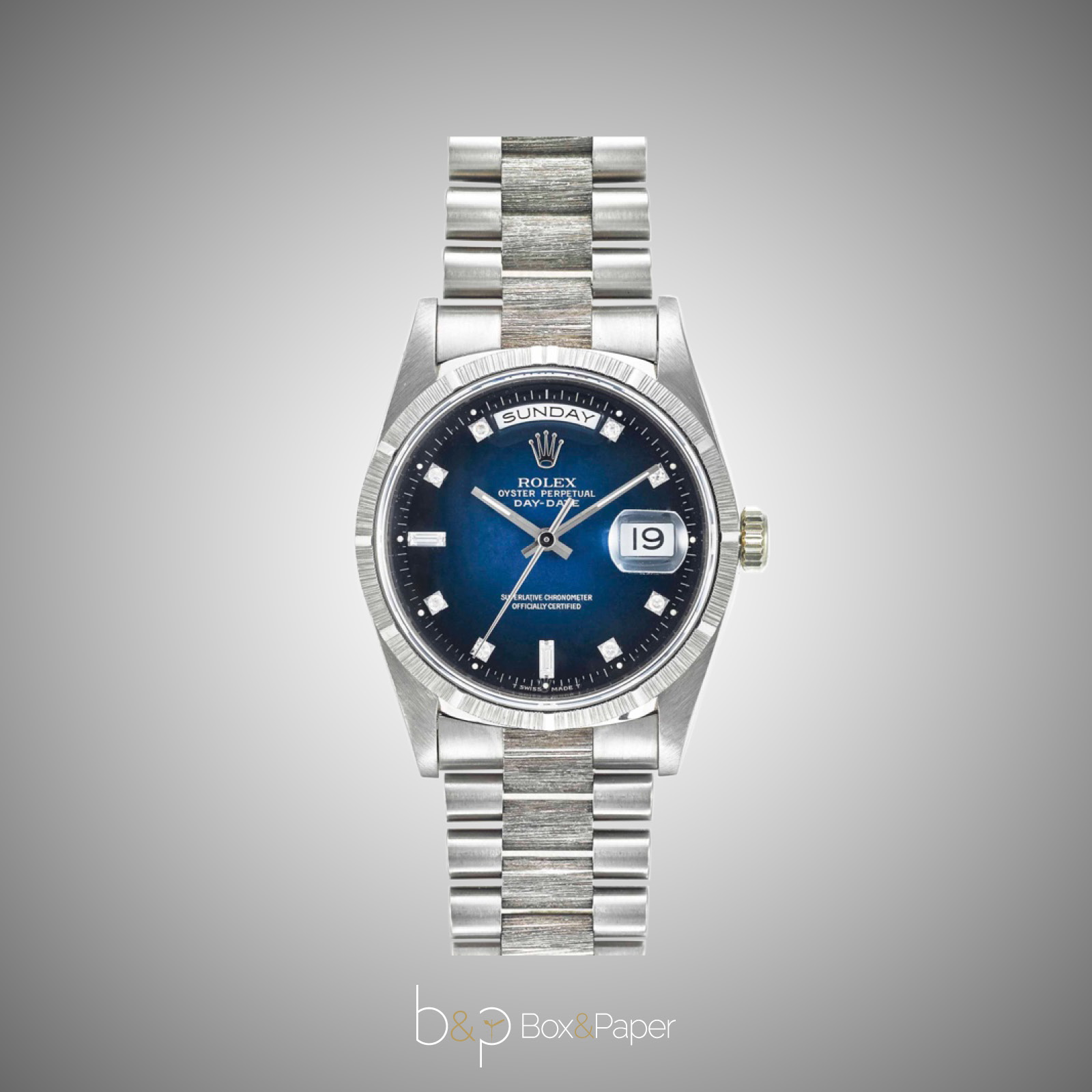 La collezione Oyster Perpetual Day-Date si rinnova a partire dal 1989 con nuove referenze che presentano l’innovativo doppio scatto rapido della data e del giorno della settimana. La referenza 18249 in oro bianco 18 ct, lunetta a corteccia con bracciale President a corteccia 8209/9 o Superpresident 8723/9. Monta il calibro 3155.