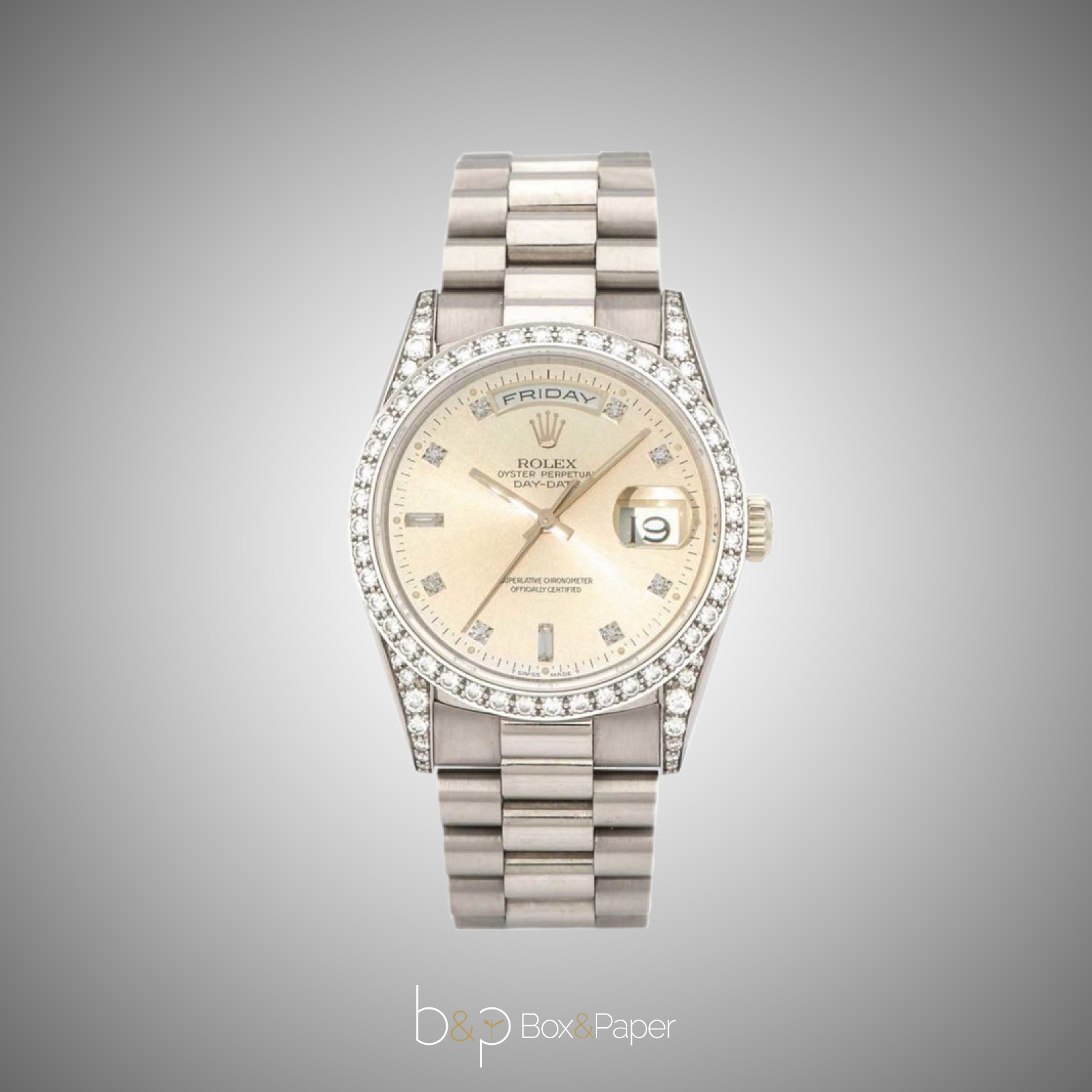 Nel 1989 Rolex presenta il nuovo Day-Date con referenza 18389. Questo esemplare, con regolazione rapida della data e del giorno della settimana, è realizzato in oro bianco 18 ct. con lunetta e anse impreziosite da brillanti. È accompagnato da un bracciale Jubilee Karat o dal bracciale President. Monta il calibro 3155 e come tutti i modelli Day-Date, questo orologio ha ottenuto il certificato COSC.