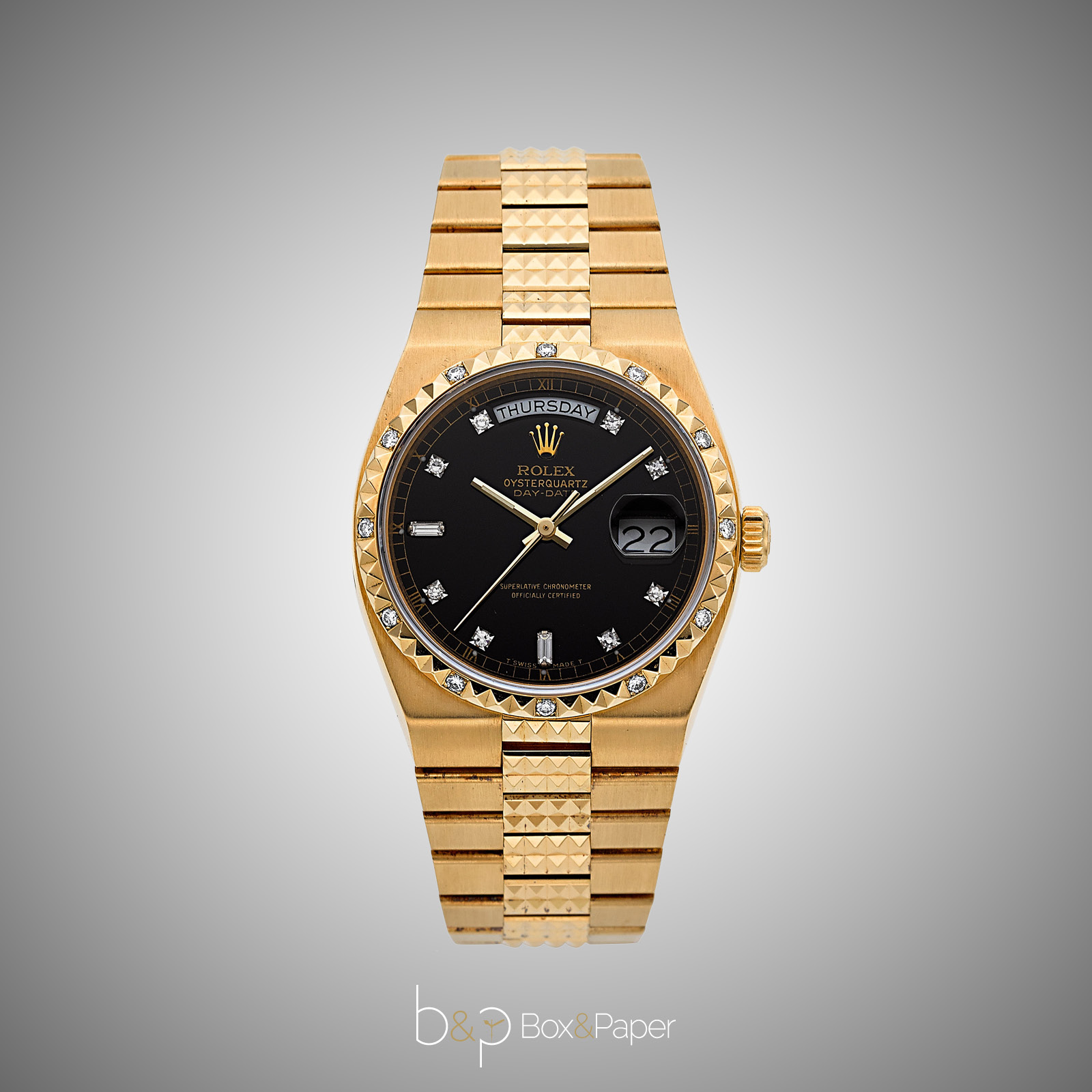 A partire dal 1982 Rolex arricchisce la collezione di Oysterquartz Day-Date con nuove referenze. Tra queste, la referenza 19038 dotata di un vetro zaffiro estremamente resistente, è realizzata in oro giallo 18 ct. e dotata di una lunetta “Décor Pyramide” con brillanti. Questa referenza in particolare resterà in commercio fino al 1989-1990. Il Day-Date 19038 è un cronometro a quarzo ufficialmente controllato e monta il calibro 5055.