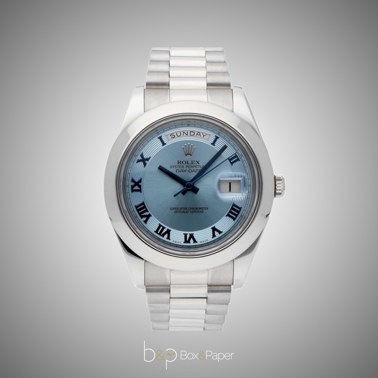 Nel 2008 Rolex presenta il Day-Date II da 41 mm di diametro. La referenza 218206 è realizzata in platino con lunetta liscia. Questo modello è equipaggiato da un bracciale SuperPresident. Monta il nuovo calibro 3156. Il Day-Date 218206 è garantito impermeabile all’acqua fino a 100 m di profondità.