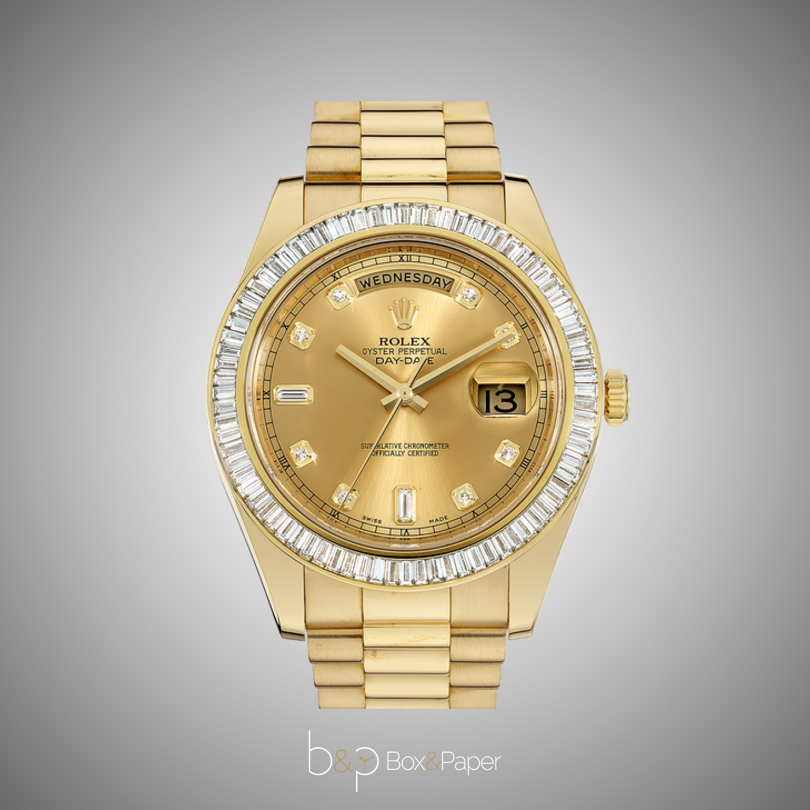 Nel 2012 Rolex amplia la sua collezione di Day-Date II con la referenza 218398 da 41 mm di diametro. Questo esemplare presenta una cassa in oro giallo 18 ct. con lunetta ornata di diamanti con taglio baguette e quadrante con otto diamanti e due rubini. Poteva essere venduto con il bracciale SuperPresident in oro giallo 18 ct. Monta il calibro 3156.