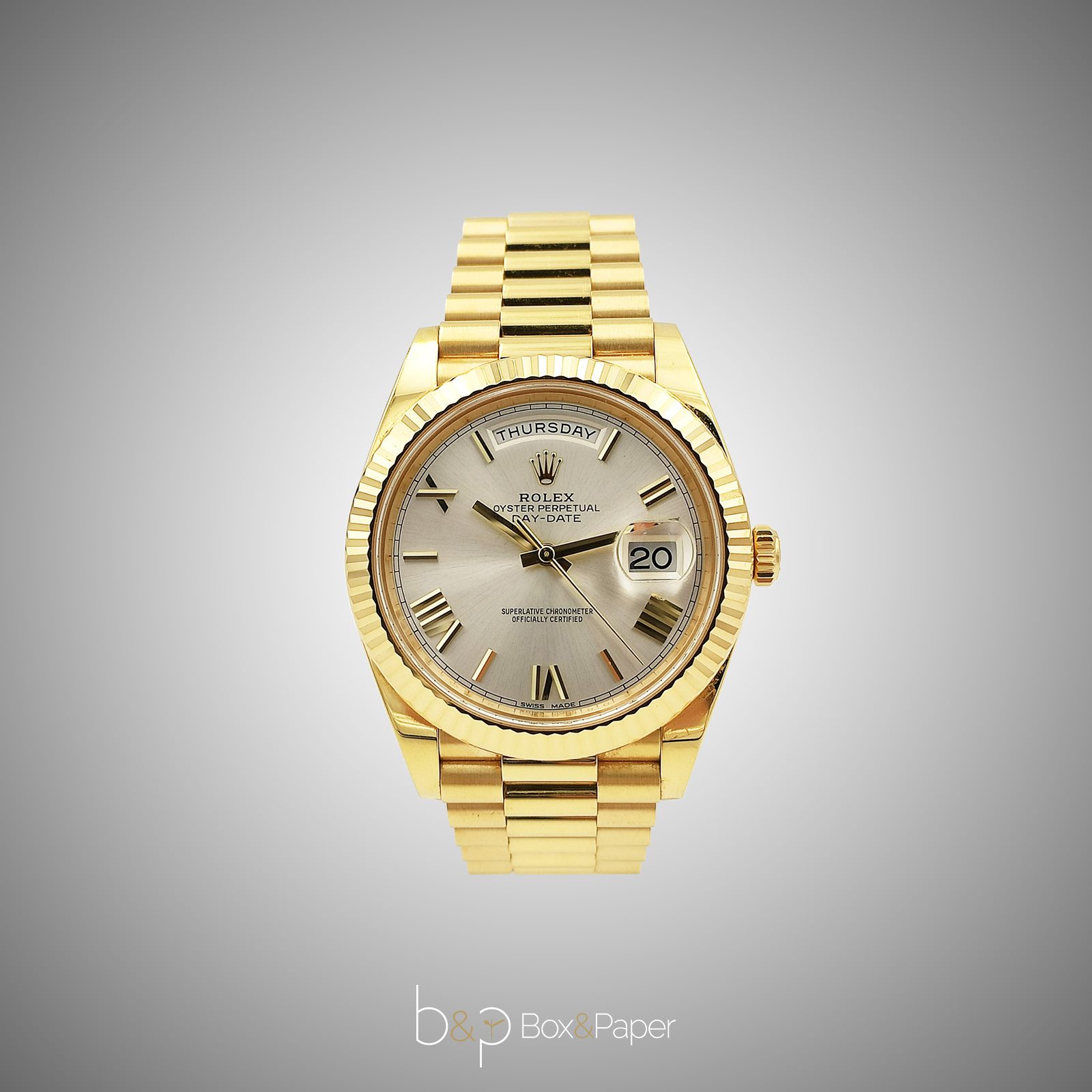 Nel 2015 Rolex presenta a Baselworld la nuova referenza 228238. Questo Day-Date da 40 mm di diametro è realizzato in oro giallo 18 ct., lunetta zigrinata in oro giallo e presenta un’ampia gamma di quadranti disponibili. Il Day-Date 228238 è equipaggiato dal bracciale President accompagnato dalla chiusura a scomparsa, l’elegante fermaglio invisibile di Rolex. È garantito impermeabile all’acqua fino a 100 m di profondità.