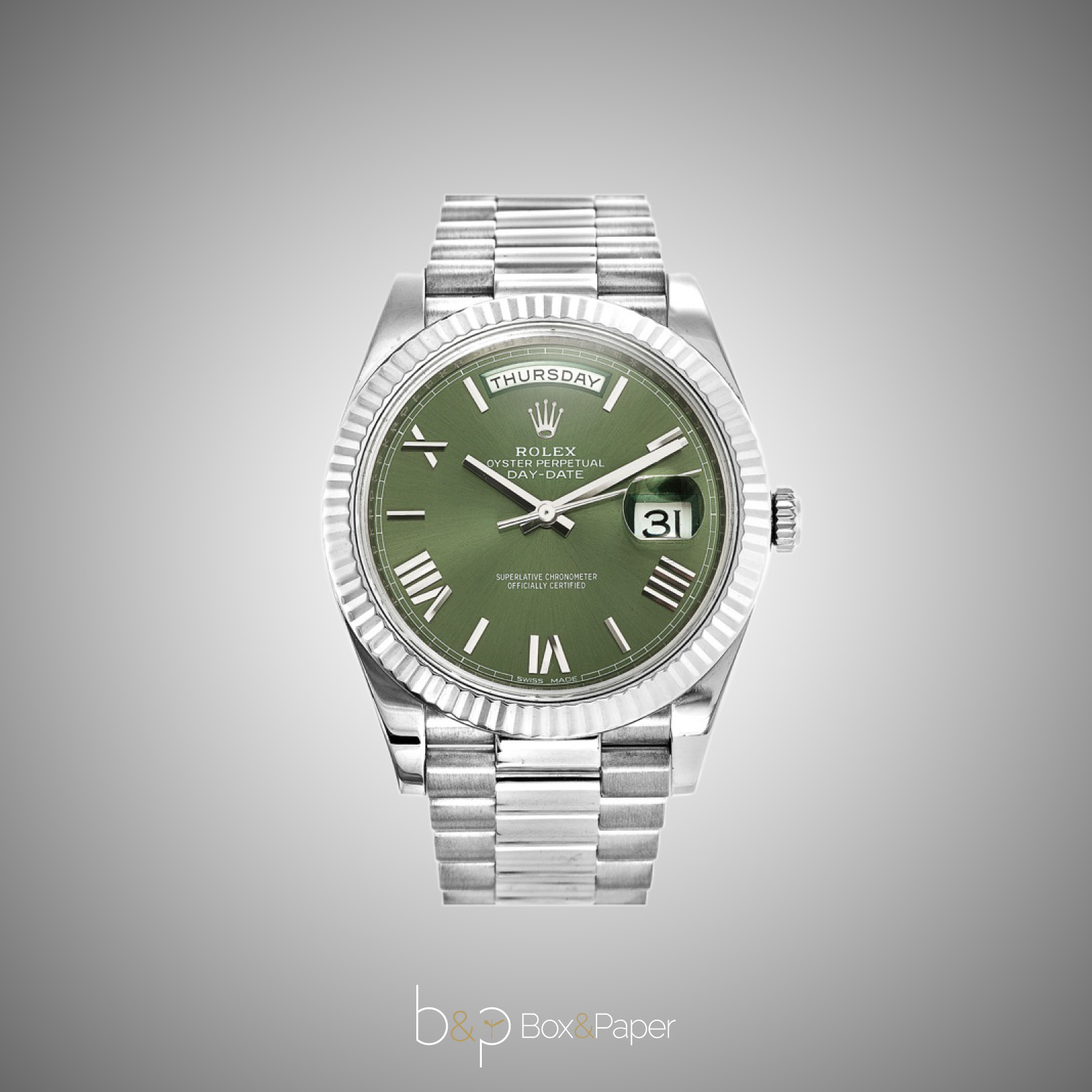 A Baselworld 2015 Rolex presenta nuove referenze Day-Date con cassa da 40 mm di diametro. Tra queste, la referenza 228239 è realizzata in oro bianco 18 carati e lunetta zigrinata in oro bianco ed è accompagnata dal bracciale President. La robusta cassa Oyster di cui è dotato questo esemplare lo rende impermeabile fino a 100 m di profondità. Monta il movimento calibro 3255 con riserva di carica di 70 ore.