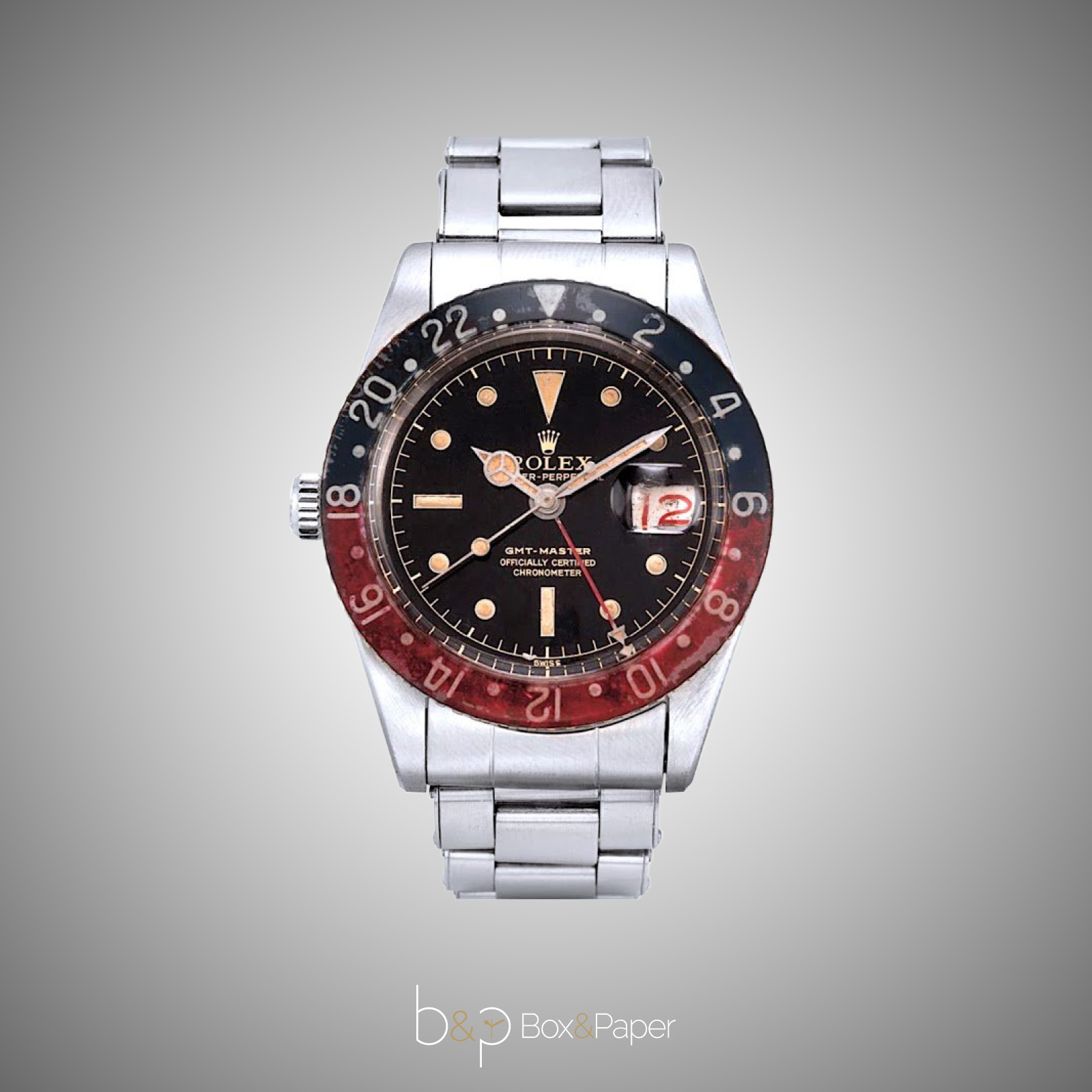 Rolex presenta a cavallo del 1954 e del 1955 il primo Gmt-Master con referenza 6542, innovativo perché consentirà la lettura simultanea di due differenti fusi orari. Veniva realizzato in acciaio o oro giallo(Ref.6542/8). Venne realizzato con un diametro di 38 mm, iconica fu la ghiera bicolore blu e rossa in bachelite che permetteva la lettura dei due fusi orari. Il modello in acciaio venne venduto con un bracciale estensibile a rivetti Flush-fit con referenza 6636, il modello in oro giallo invece fu venduto con un bracciale in cuoio e fibbia marcata Rolex in oro 18 ct. Le grafiche all’interno del quadrante potevano essere bianche, argento o la più ricercata in oro, chiamata oggi tra i collezionisti “Gilt Dial”. La lancetta rossa che permetteva la lettura del doppio fuso orario era denominata “Freccino”, la lunetta inizialmente veniva prodotta in bachelite con i numeri che contenevano una sostanza chiamata “Radium”. Successivamente, indici e lancette furono sostituite dalla Rolex con il Trizio in quanto il “Radium” creava problemi con i metal detector. Fino al 1964 circa nel quadrante troviamo solo la scritta SWISS a ore 6, sostituita successivamente, dalla scritta SWISS T<25. Questo orologio venne creato grazie alla collaborazione tra la Rolex e la compagnia aerea Pan am.