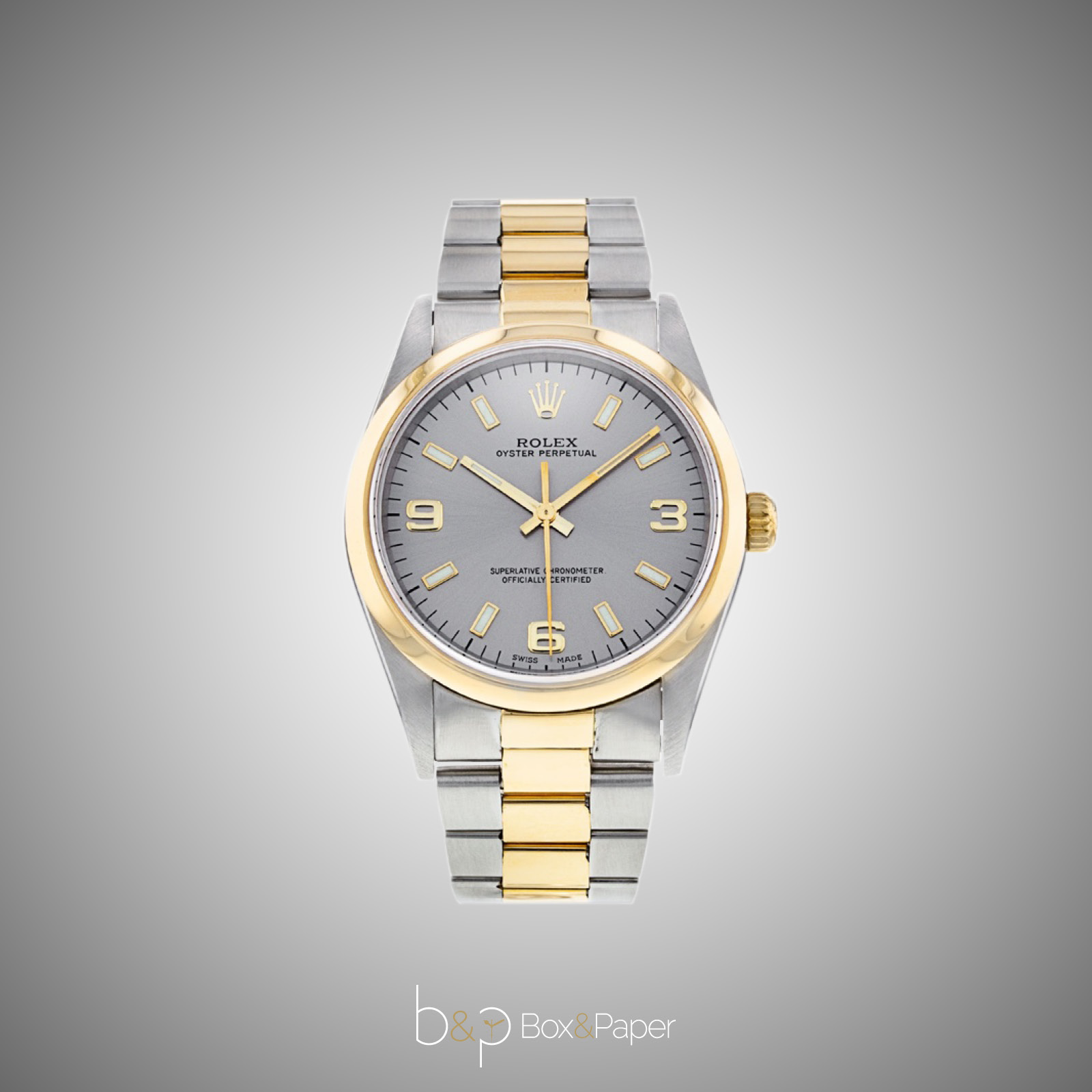 Nel 1991 Rolex presenta i nuovi modelli di Oyster Perpetual, uno di essi è il 14203 che presenta una cassa da 34 mm ed è realizzato in acciaio e oro giallo con una lunetta liscia. Viene equipaggiato con un bracciale Oyster in acciaio e oro ref. 78353 a seguito del cambio di calibro (il 3130) nel 2001, la referenza diventerà 14203 M.