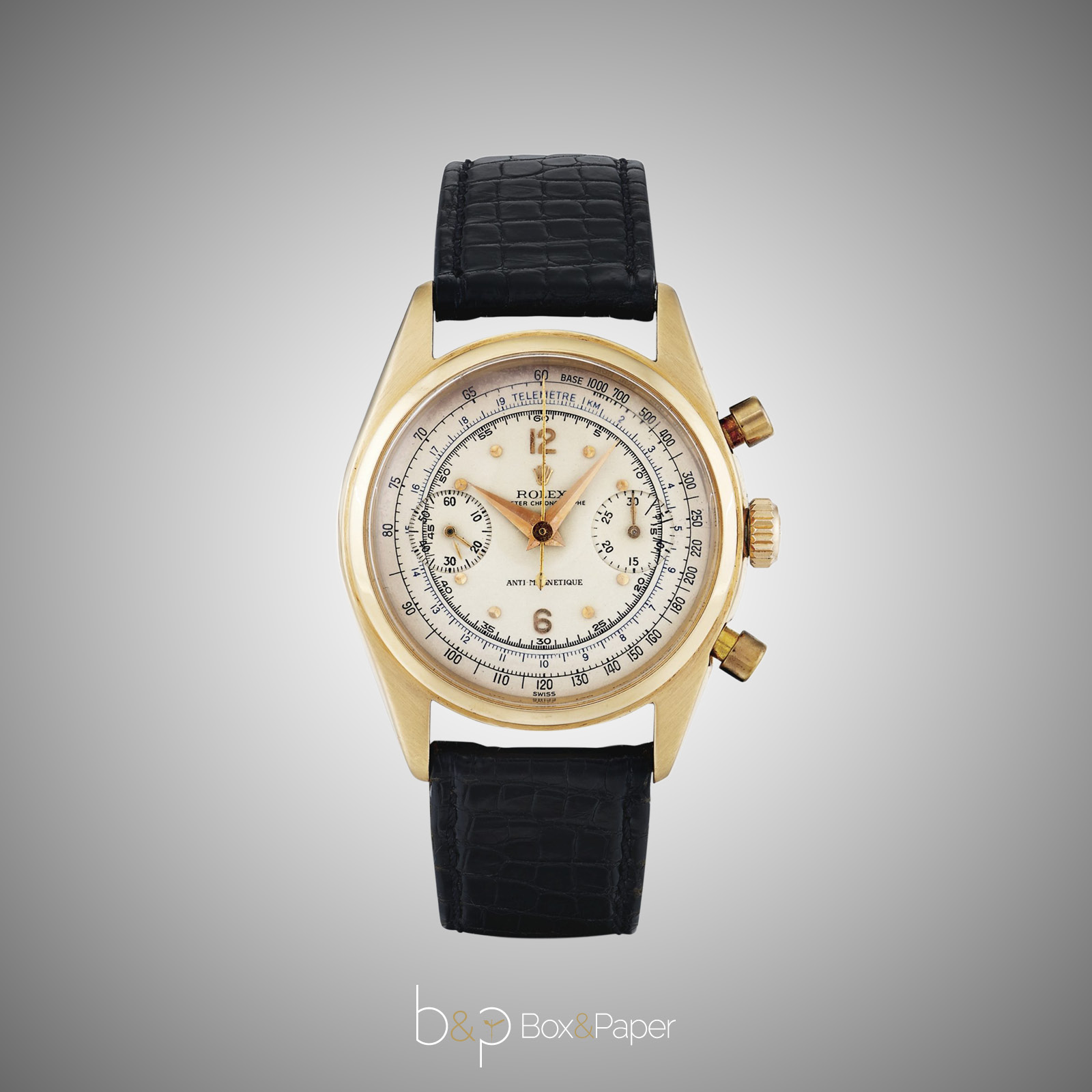 Nel 1950 Rolex presenta sul mercato un interessante nuovo cronografo, la referenza 6032 con calibro 13 Chrono 72b. Questo modello è dotato di cassa Oyster, all’interno del quadrante presenta due contatori e due scale: telemetrica e tachimetrica. Presenta inizialmente una corona super Oyster, corona di carica impermeabile con guarnizione in gomma al posto della chiusura a vite, sostituita solo in un secondo momento dalla corona Twinlock. La referenza è incisa all’interno del fondello e sulla cassa a ore 12. Il numero della cassa invece è inciso alle ore 6.