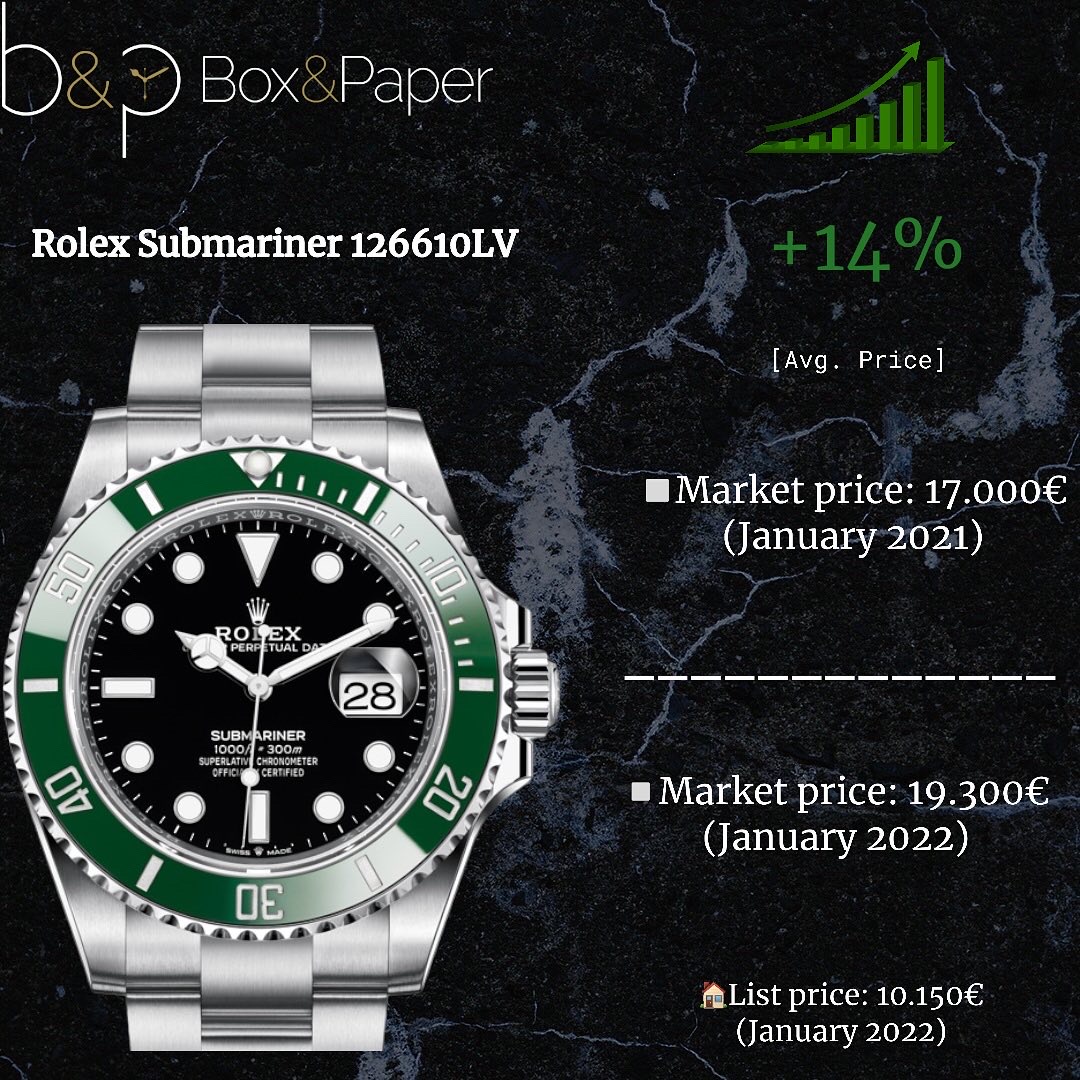 Grafico di comparazione prezzi Submariner 126610LV, prezzo retail(listino), prezzo medio a Gennaio 2021, prezzo medio a Gennaio 2022.